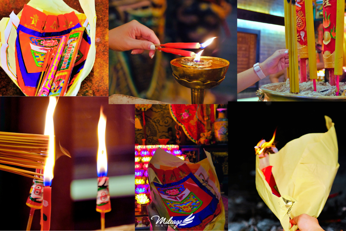 2 ยืนเบื้องหน้าเจ้าแม่ทินหัวองค์ประธาน จุดเทียนสองเล่มพร้อมกัน โดยห้ามต่อไฟจากเทียนของคนอื่น