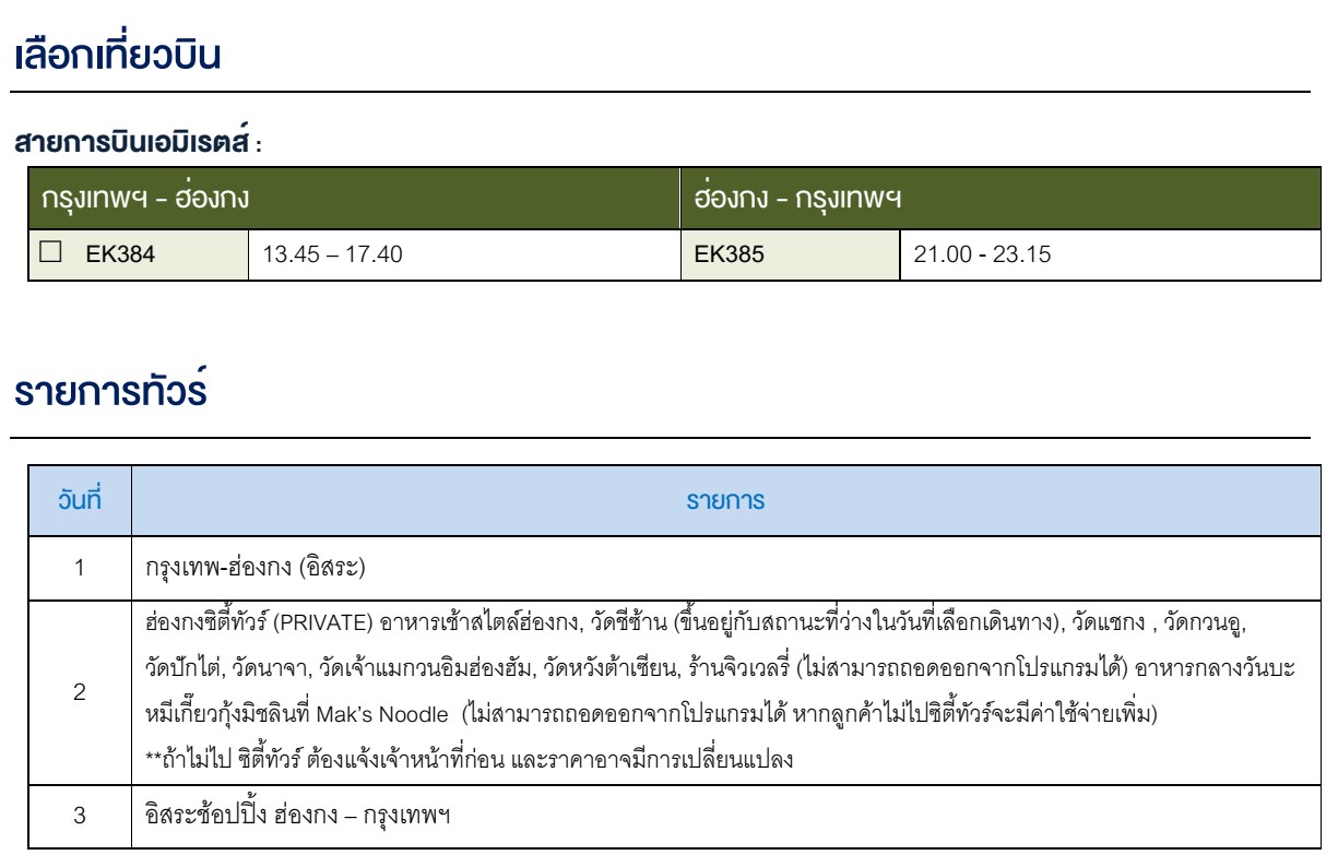| วันแรก กรุงเทพ - ฮ่องกง (อิสระ) |